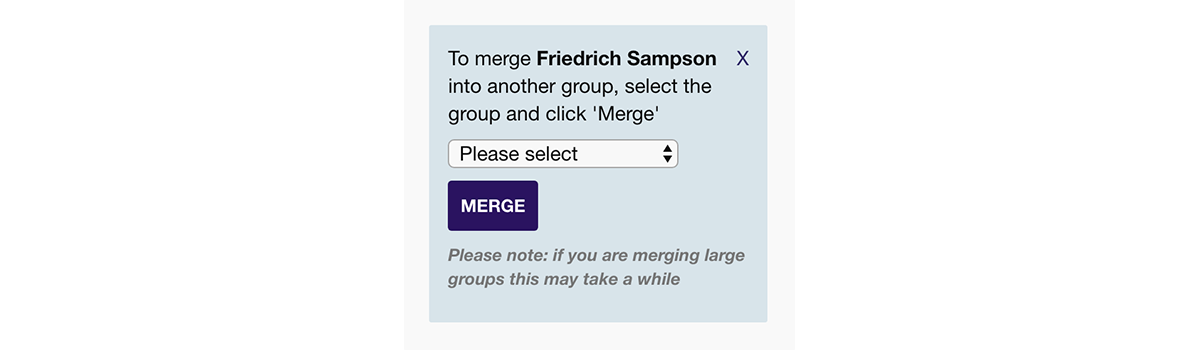 - Within the group overlay, you'll see a button a the bottom left, 'Merge into another group'. If you click this, a select box with a list of your other groups will appear.
