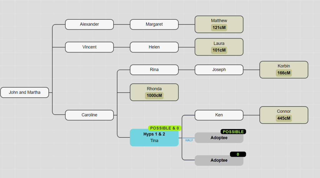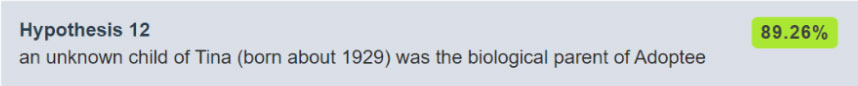 Currently, the top hypothesis is that the parent of the adoptee is a child of Tina, who is a half-sibling to Tina’s other child Ken. WATO will usually add hypothetical half-siblings to the tree, and these are often the highest probability. If all the known family members have been added to the tree, adjusting the settings so that no new people are added to the tree can further refine results.