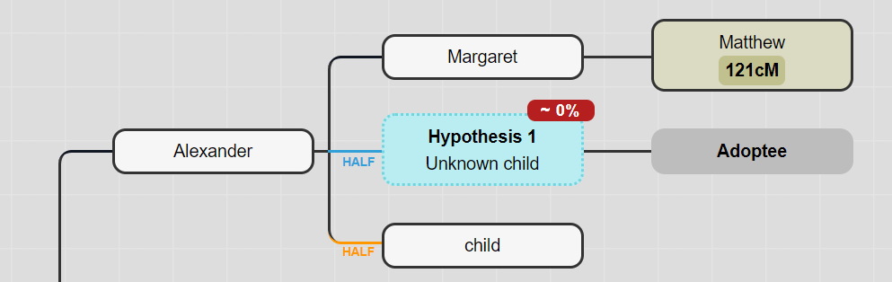 For example, a full sibling of Margaret was not added as a hypothesis. Adding another child to Alexander will add another half-sibling, who is a half-sibling to both Margaret and the unknown child that WATO added.