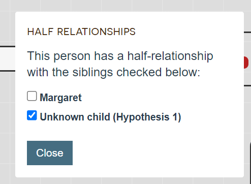 To define half-relationships, mouse over the newly added child and select which relationships are half. Unchecking the box next to Margaret’s name means this child is her full sibling.