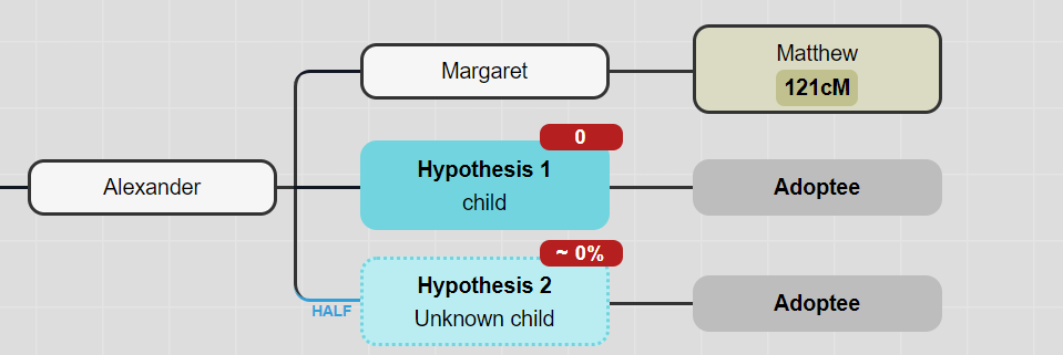 Hypotheses with a red bubble and zero percent are not possible. For example, it is not possible that Margaret’s half-sibling is the parent of the adoptee.