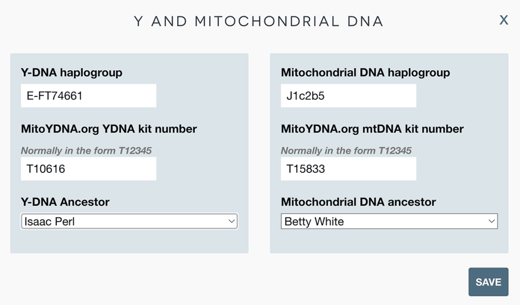 Even if you haven’t taken a specific Y- or mitochondrial test, you can enter your Y- and mitochondrial DNA ancestor if you know the identity of your biological parents: