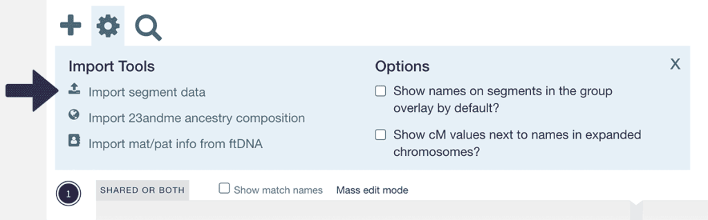 Importing the FamilyTreeDNA Chromosome Painter file is currently available only to DNA Painter subscribers, via the general ‘Import segment data’ tool, available via the settings cog above chromosome 1.