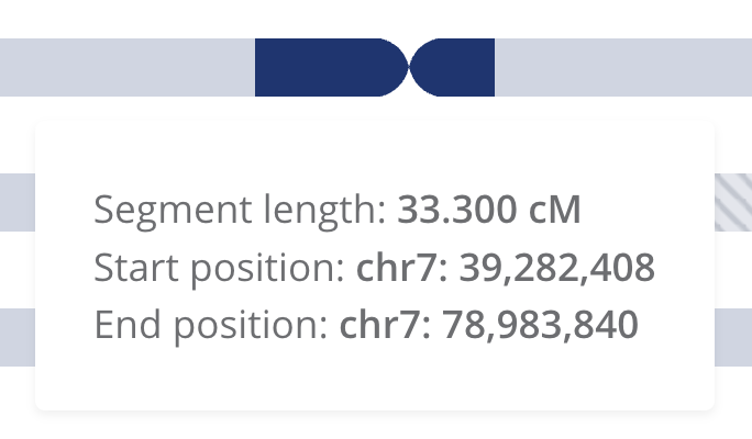 You’ll see a familiar-looking representation of the 22 autosomes, with the shared segments marked in dark blue. When you hover, you can find out more information about each segment. For a more in-depth look at what is provided, please read on.